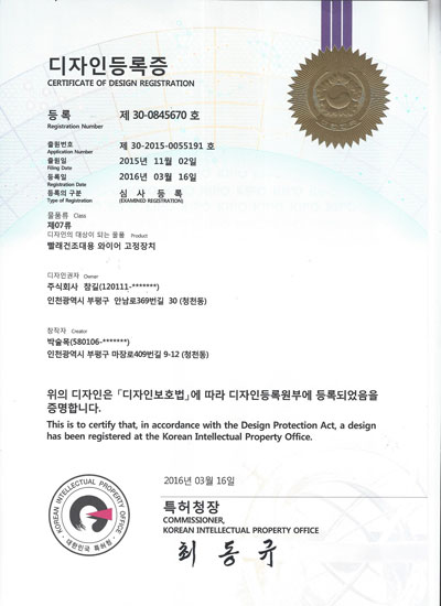 [디자인등록증] 빨래건조대용 와이어 고정장치